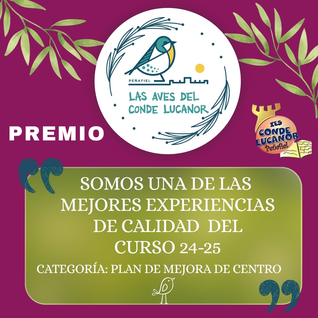 Por segundo año consecutivo, nuestro proyecto Las aves del Conde Lucanor, ha sido premiado como una de las “Mejores experiencias de calidad de Castilla y León del curso 24/25”. Esto nos motiva a seguir trabajando por la educación ambiental y la mejora del centro y nuestro entorno. Gracias a tod@s por hacerlo posible |